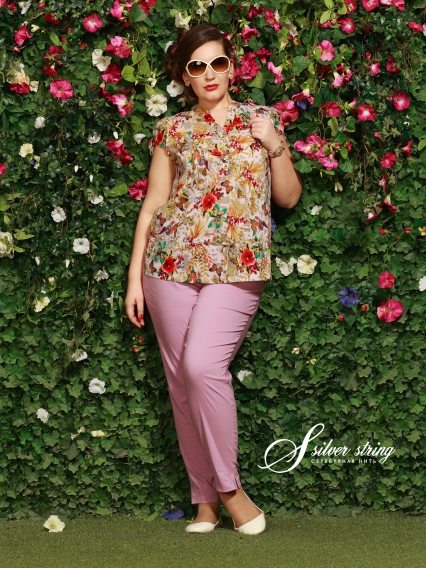Зауженные брюки из эластичной ткани с хлопковым и вискозным волокном. Особый комфорт в посадке на фигуре достигается за счет эластичной тесьмы, по задней части пояса. В боковых швах обработаны небольшие разрезы.